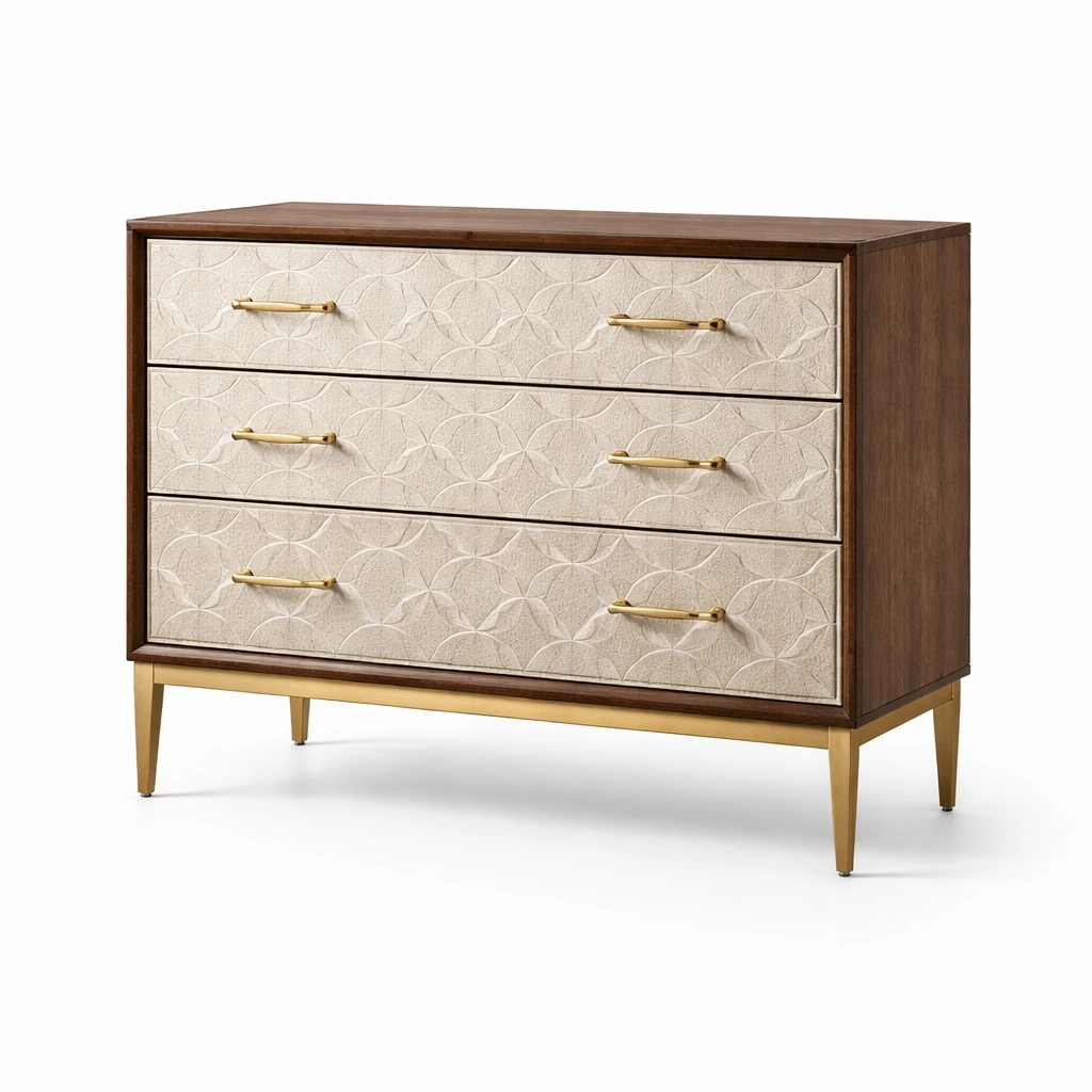 Cajonera de madera de nogal con frentes grabados y patas doradas