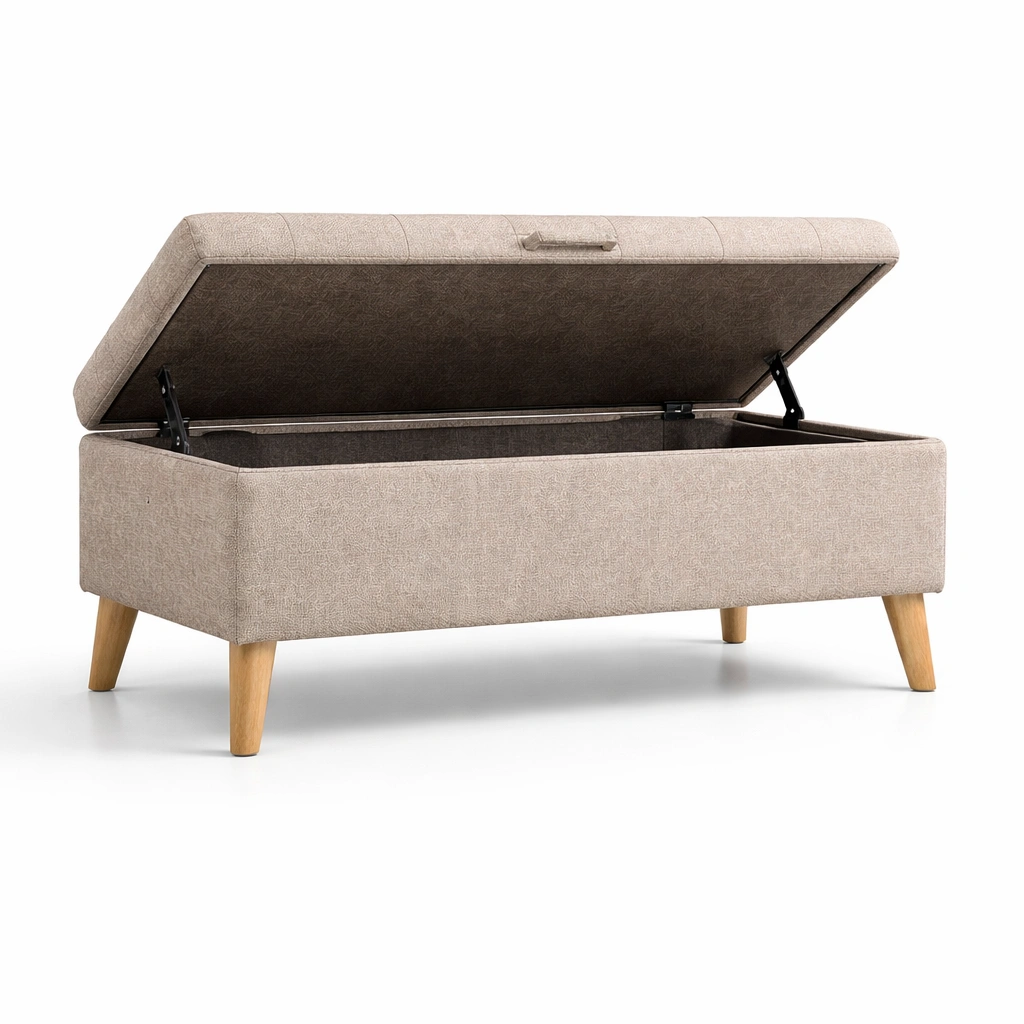 Banco de almacenamiento con revestimiento de poliéster. La estructura interior es de MDF y las patas son de madera. Presenta un acabado en color Beige. Las dimensiones son 100 cm de largo, 40 cm de ancho y 45 cm de alto. Peso total de 12 kg, ofrece almacenamiento funcional con capacidad de asiento gracias a su tapa abatible.