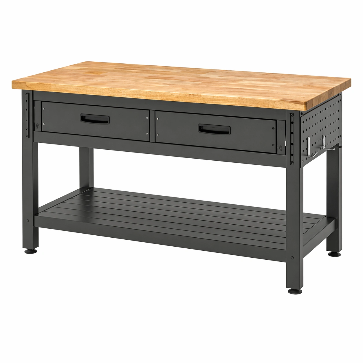 La mesa de trabajo está construida con una estructura de metal y una superficie de madera maciza, garantizando durabilidad y estabilidad. Sus dimensiones son 120 cm de largo, 60 cm de ancho y 90 cm de alto. Incluye 2 cajones para almacenamiento y un estante inferior. El peso total es de 40 kg. El color principal es Negro con detalles en Madera Natural. Diseñada para uso en interiores.